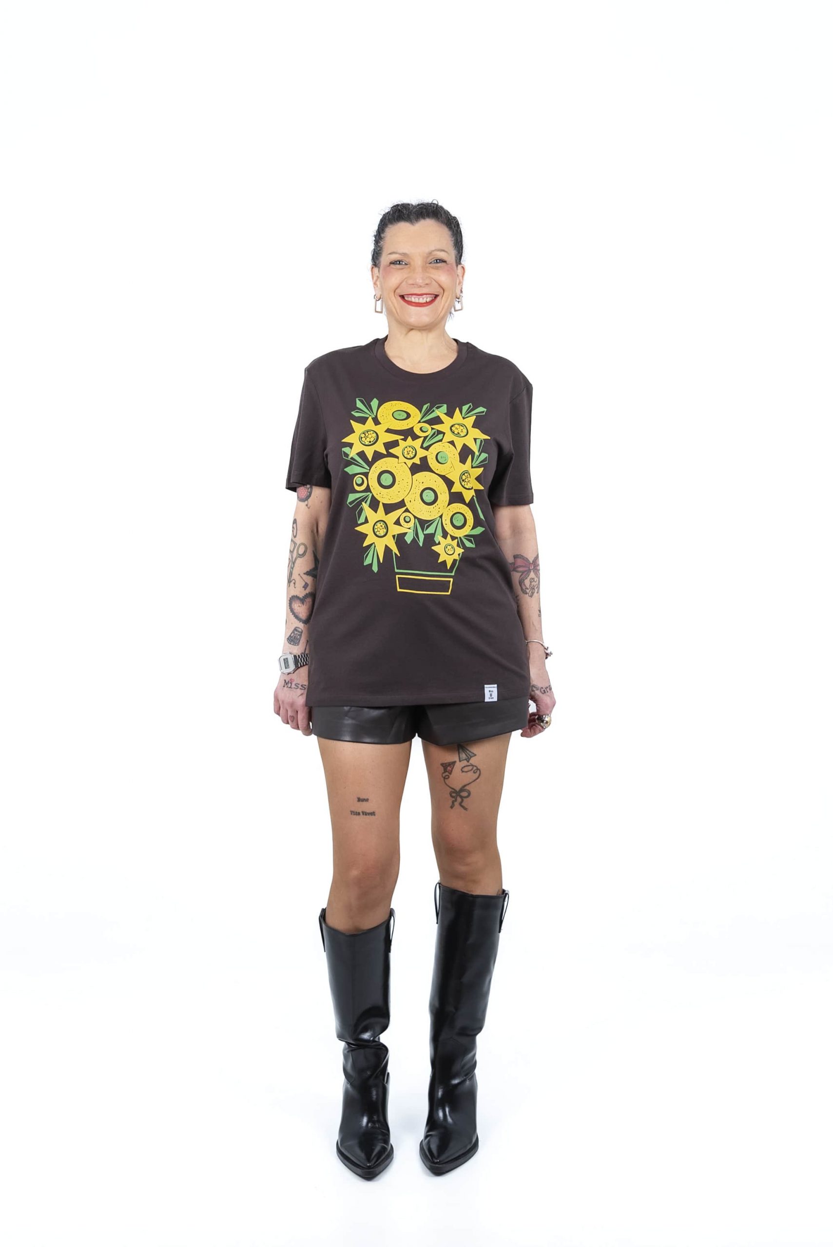 Inspirada en los famosos «Girasoles» de Van Gogh, esta camiseta en color marrón aporta calidez y arte a tu armario. Con su diseño exclusivo serigrafiado a mano en tonos amarillo y verde, es una prenda con fuerza y mucha personalidad. Su tejido 100% algodón orgánico y su ajuste fluido aseguran el máximo confort.