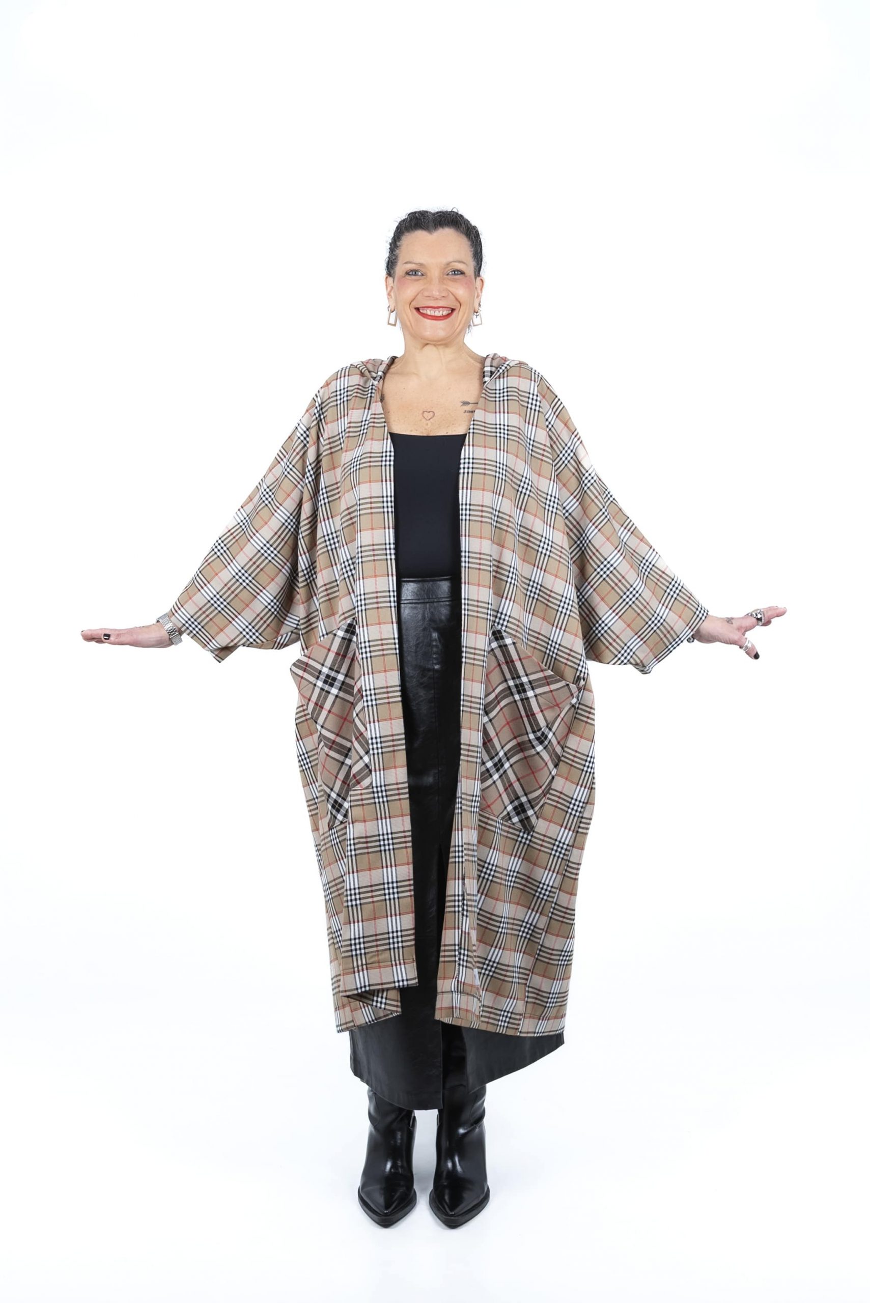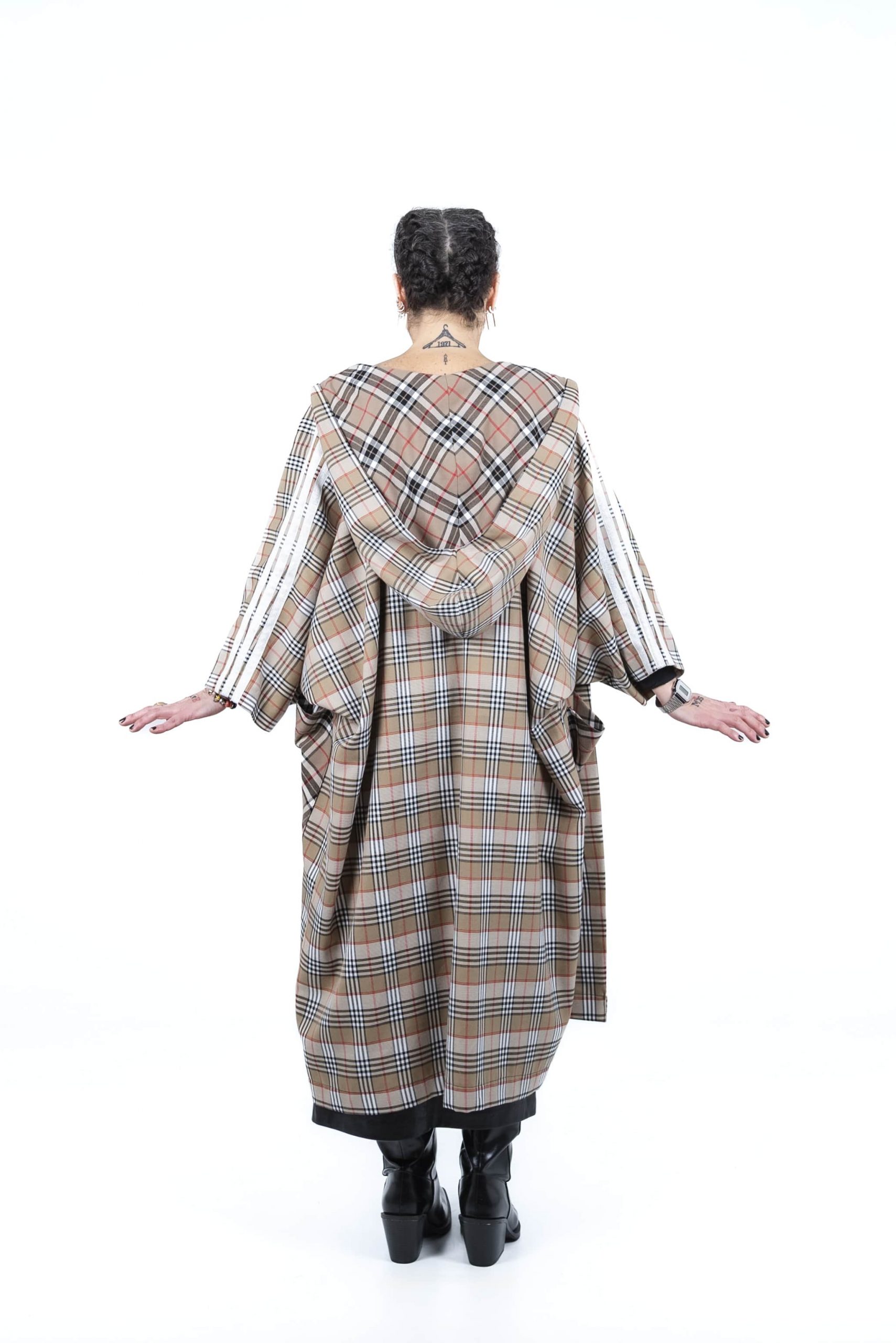 Envío Gratuito a partir de 60€.Kimono con capucha de diseño único y patrón oversize unisex, abarca desde la S hasta la XL. Confeccionado combinando dos estampados de sarga en cuadros (62% poliéster, 35% algodón y 3% elastano) con bolsillos delanteros de parche.