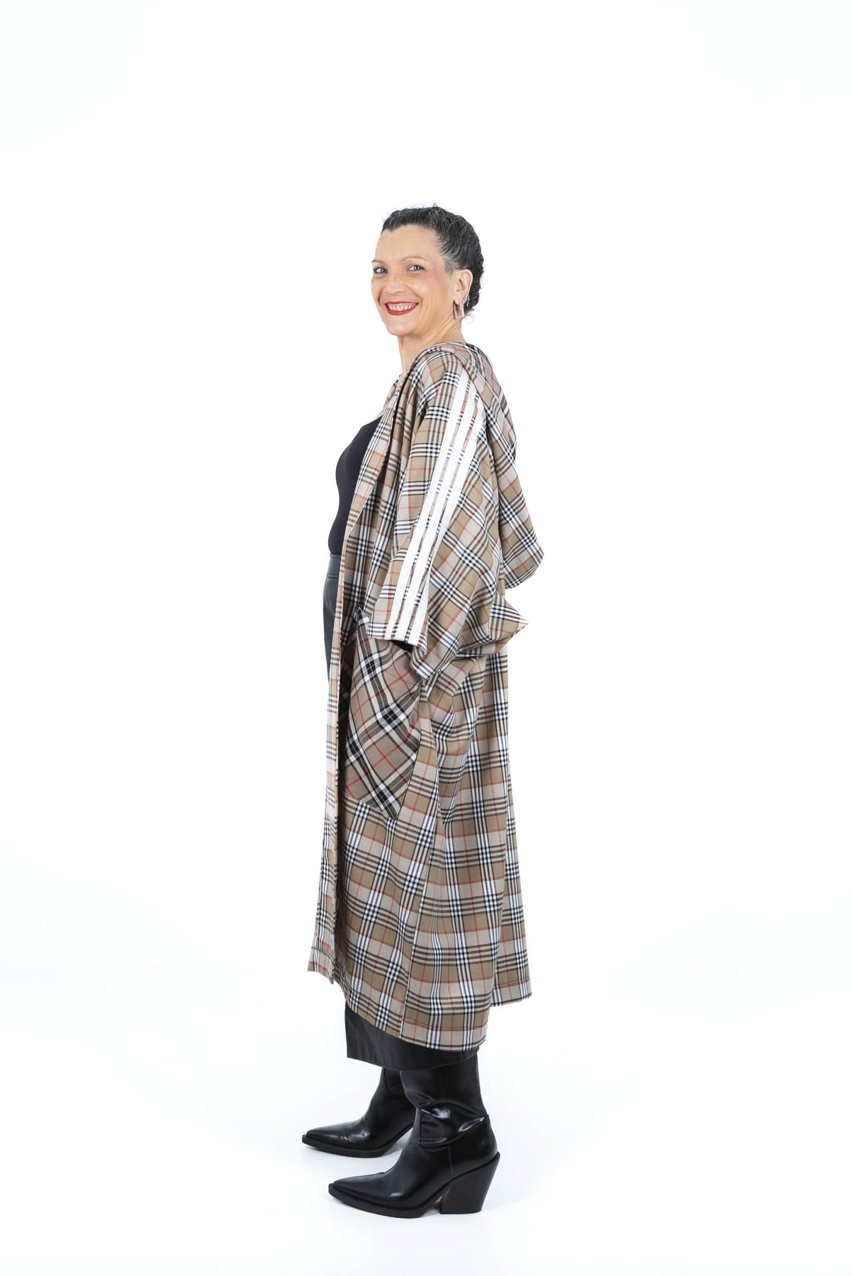 El Kimono Amparo Capucha es una pieza única de diseño y confección propia que combina dos variantes del icónico estampado de cuadros burberry en una estructura de sarga. Con un patrón oversize y unisex, este modelo cuenta con una capucha integrada y dos amplios bolsillos de parche delanteros que refuerzan su funcionalidad. Su tejido, que mezcla algodón y un toque de elastano, ofrece una caída estructurada pero cómoda, ideal para quienes buscan una prenda exterior exclusiva con un aire clásico renovado.