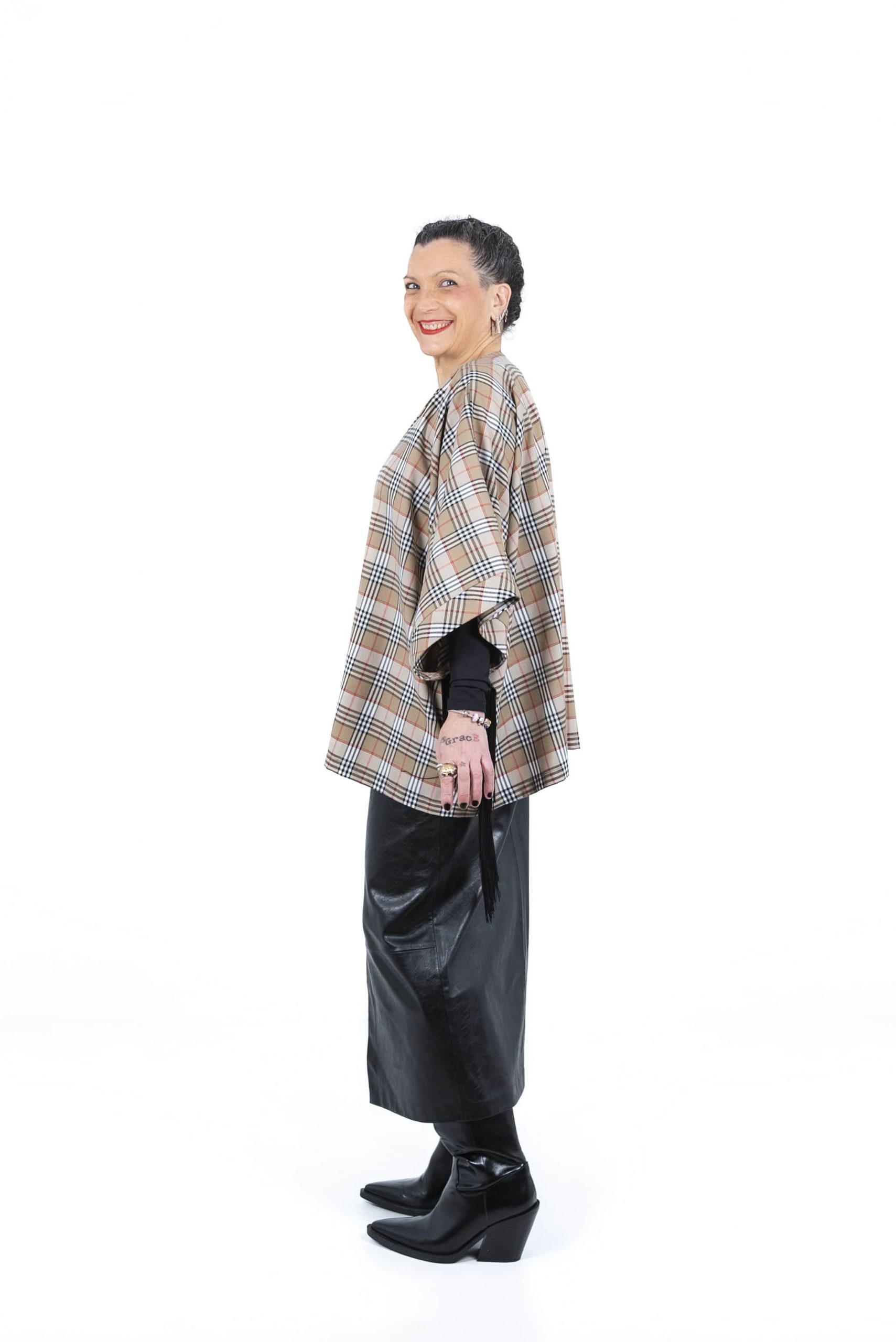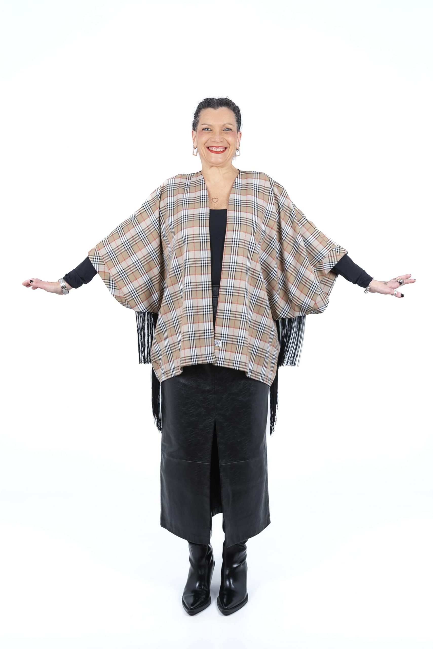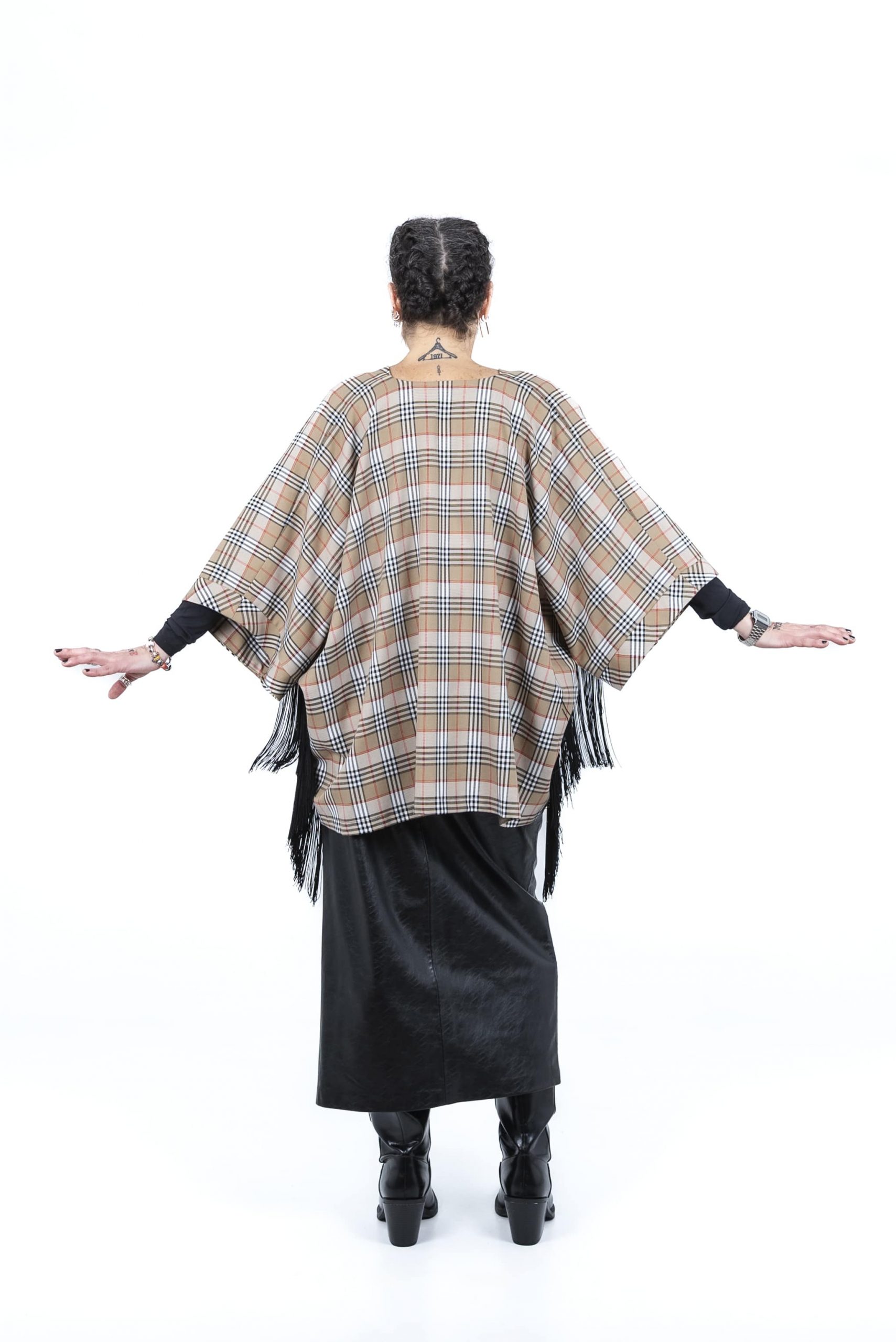 El Kimono Leonor Corto es una pieza única de diseño y confección propia que reinterpreta el estilo clásico del cuadro burberry. Con un patrón oversize y unisex, está realizado en una sarga que combina algodón y elastano para ofrecer un tacto agradable con un punto de elasticidad. Su detalle más distintivo son los flecos de poliéster situados debajo de las mangas, que aportan dinamismo y un aire artesanal a esta prenda exclusiva de autor.