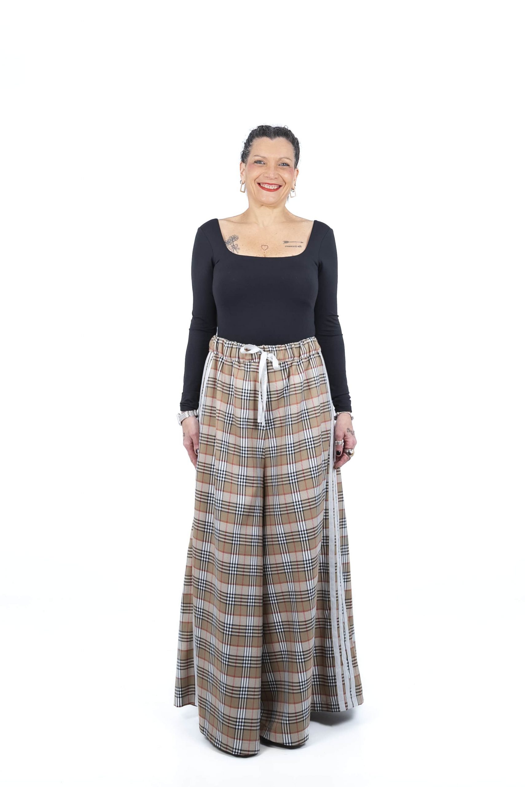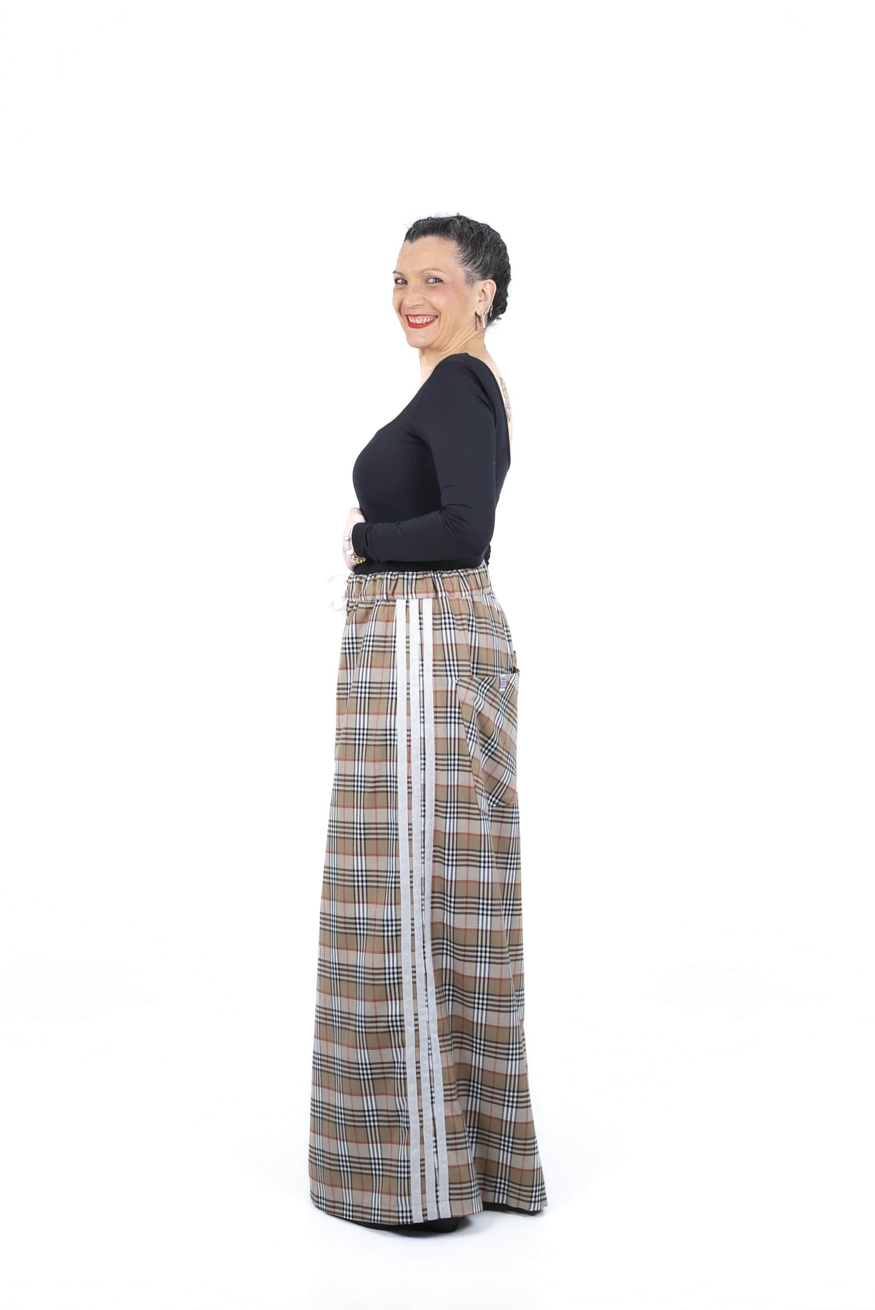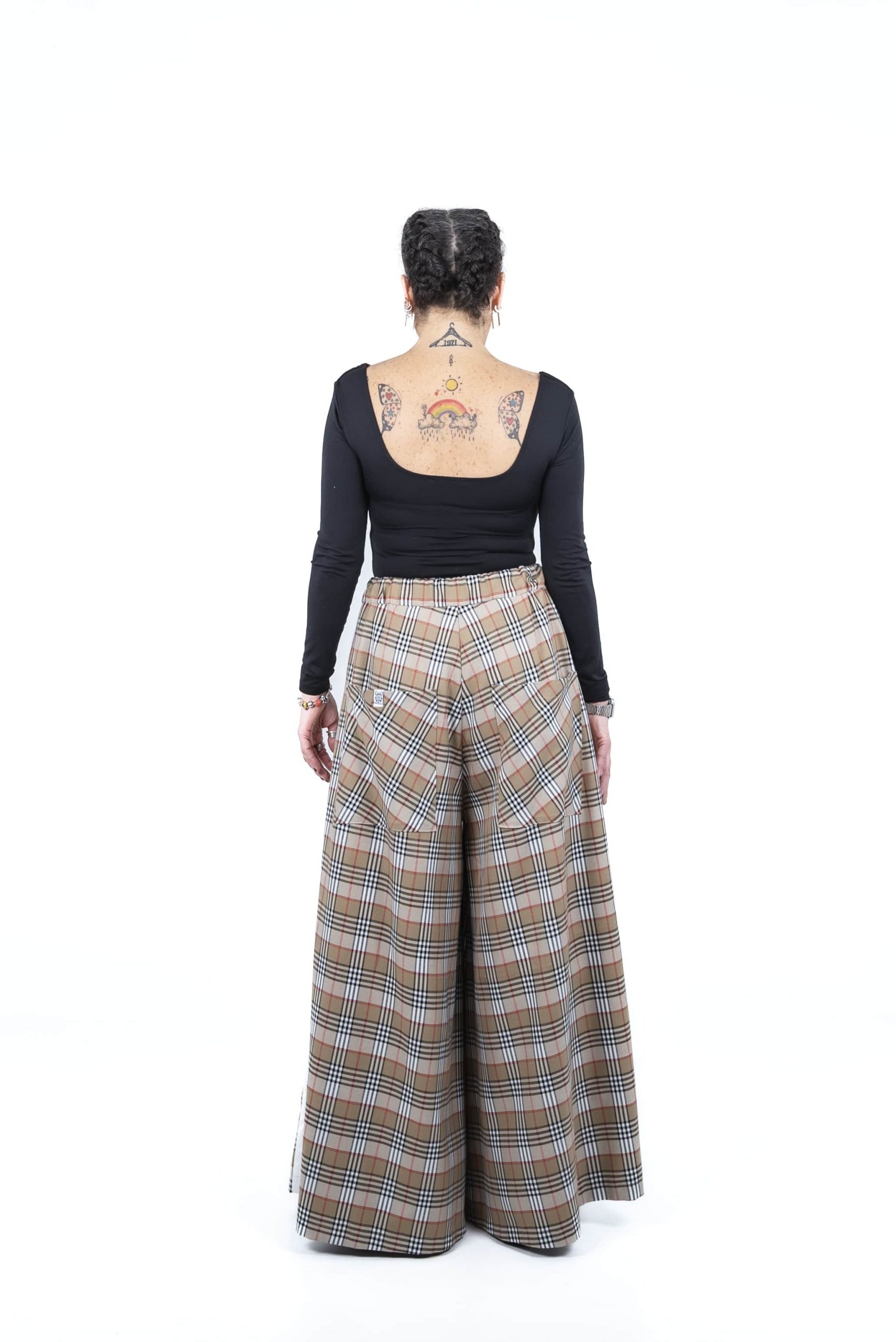 El Pantalón Mercedes es una pieza única de diseño y confección propia que combina la elegancia del cuadro tipo burberry con un corte de pata de elefante muy actual. Su cintura elástica garantiza un ajuste cómodo y versátil, mientras que el tejido de sarga con mezcla de algodón y elastano ofrece una estructura suave con la elasticidad justa. Los laterales están decorados con cintas de algodón blancas y lurex, aportando un destello sutil y deportivo a esta prenda exclusiva, que se completa con dos funcionales bolsillos de parche en la parte trasera.