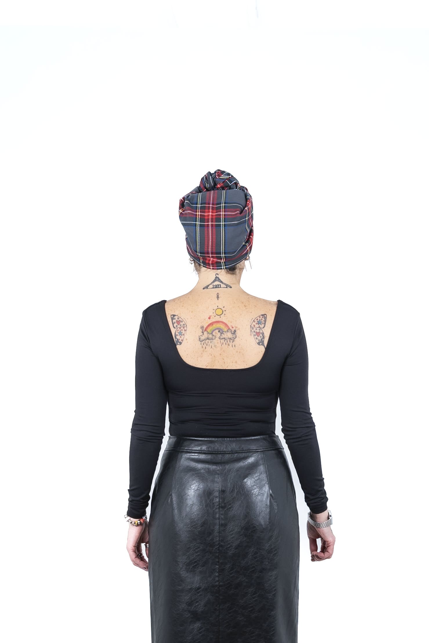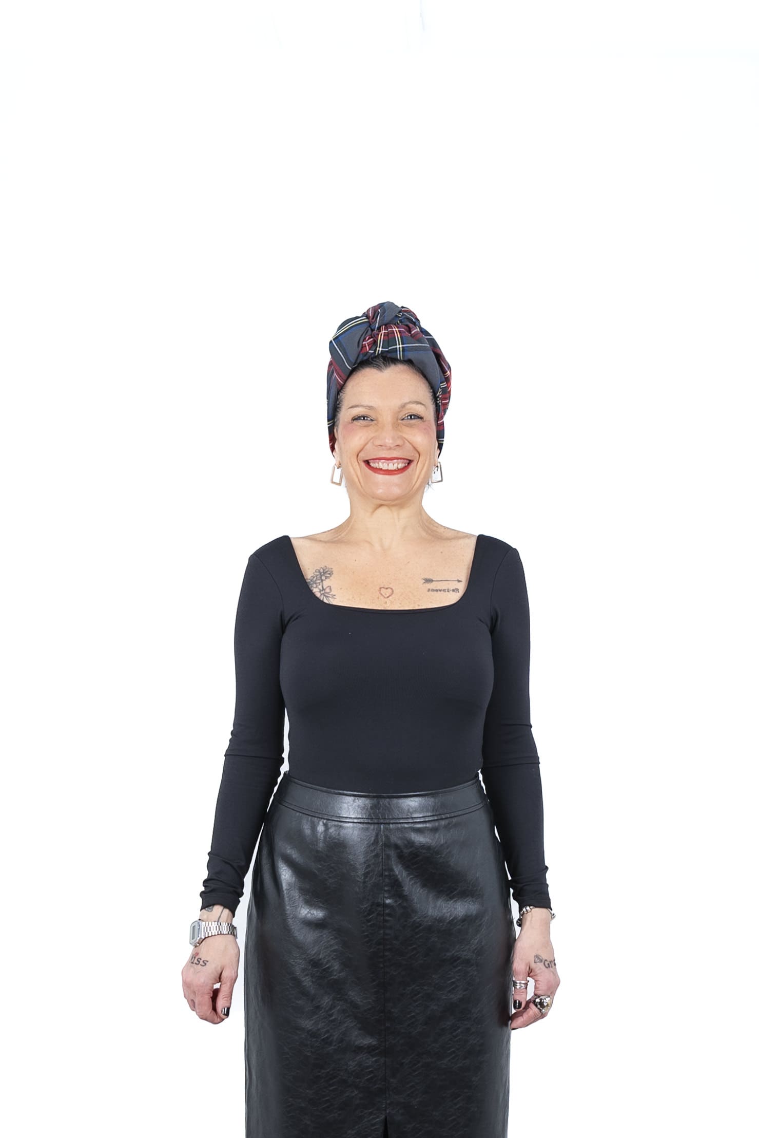 Envío Gratuito a partir de 60€.Pañuelo triangular de diseño único para uso como turbante. Confeccionado en sarga de cuadros escoceses gris, compuesto por 64% poliester, 34% viscosa y 2% elastano.