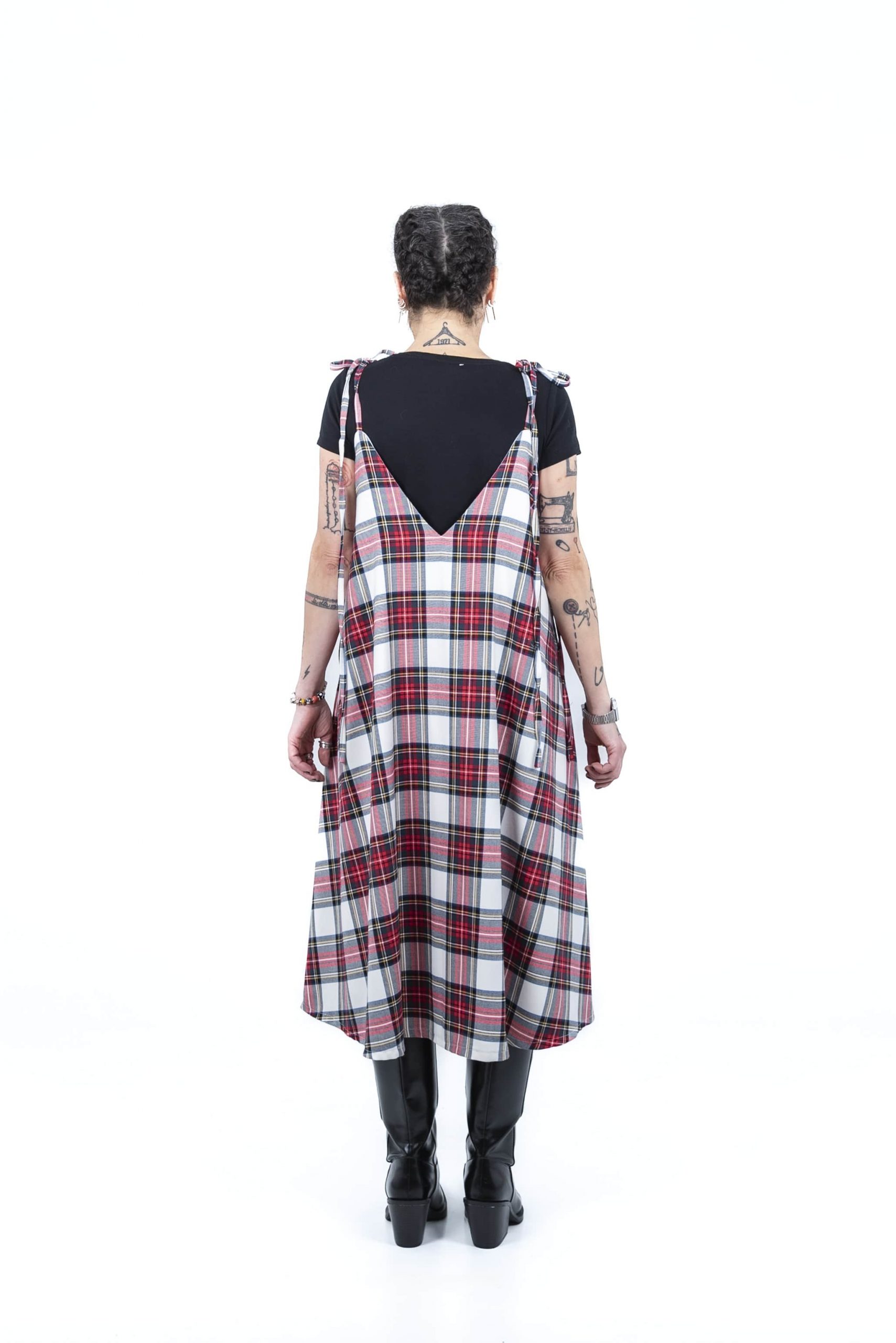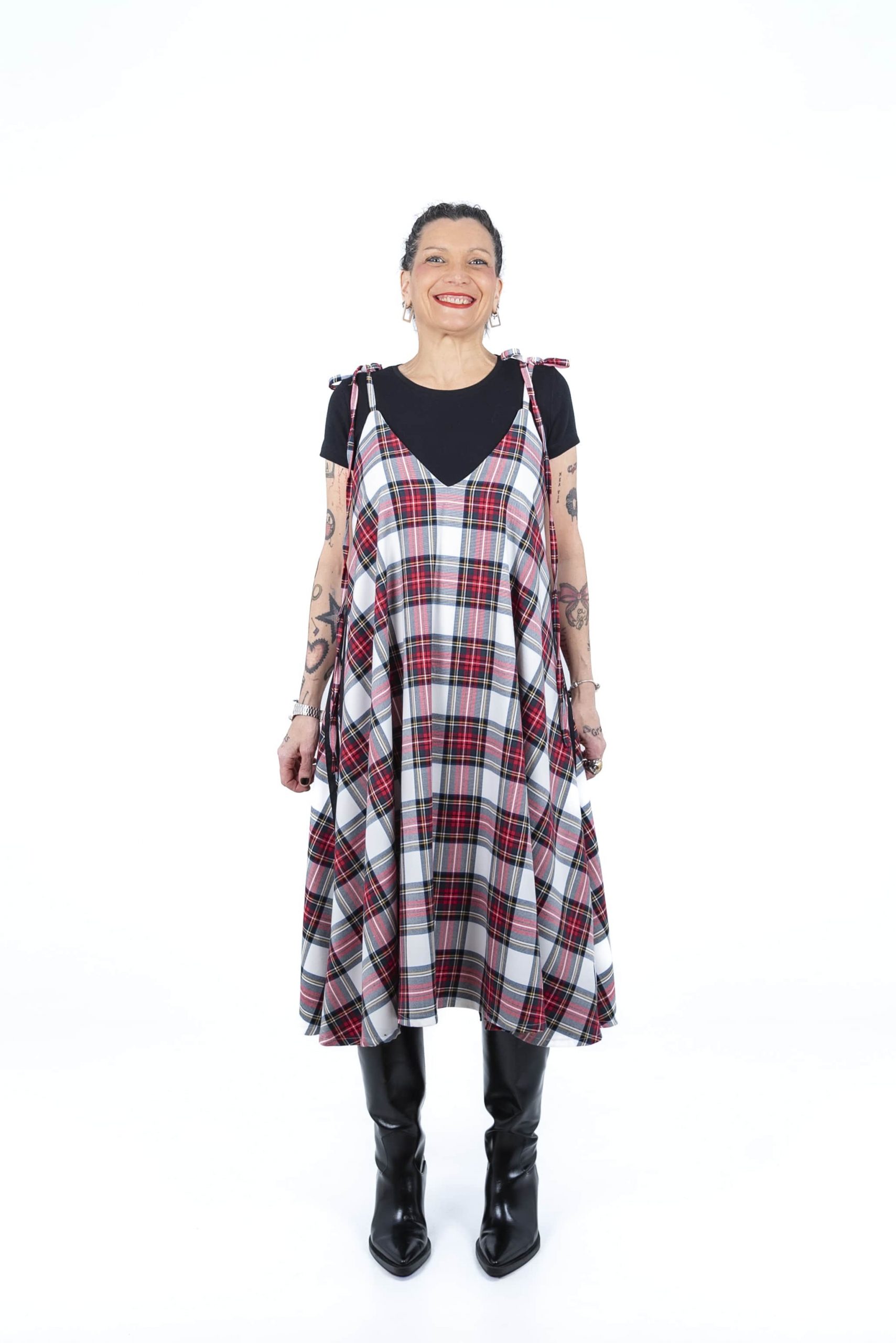 Envío Gratuito a partir de 60€.Vestido único de diseño propio con tirantes ajustables, escote de pico y corte en un cuarto de capa. Confeccionado en sarga de cuadros blancos (80% poliéster y 20% viscosa) con forro de punto y detalles laterales en algodón negro. Abarca de la talla S a la L.
