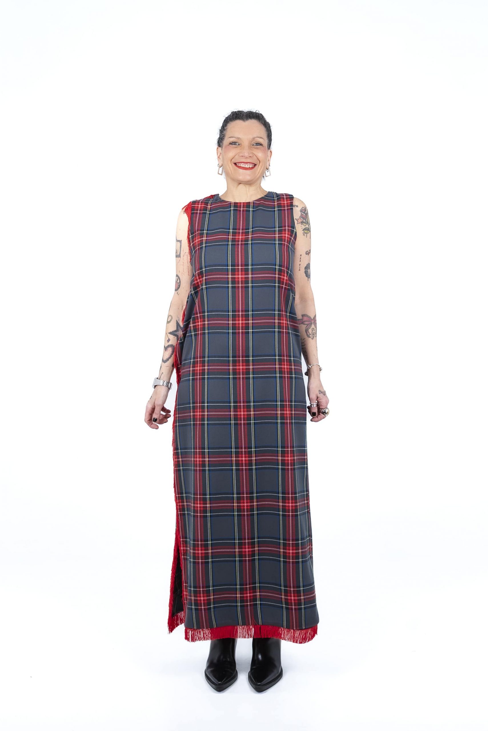 Envío Gratuito a partir de 60€.Vestido largo de diseño único, abarca de la tallas S a M. Confeccionado en sarga de cuadros grises (64% poliéster, 34% viscosa y 2% elastano), cierre con broches y acabado en mimi fleco rojo en lateral y bajo.