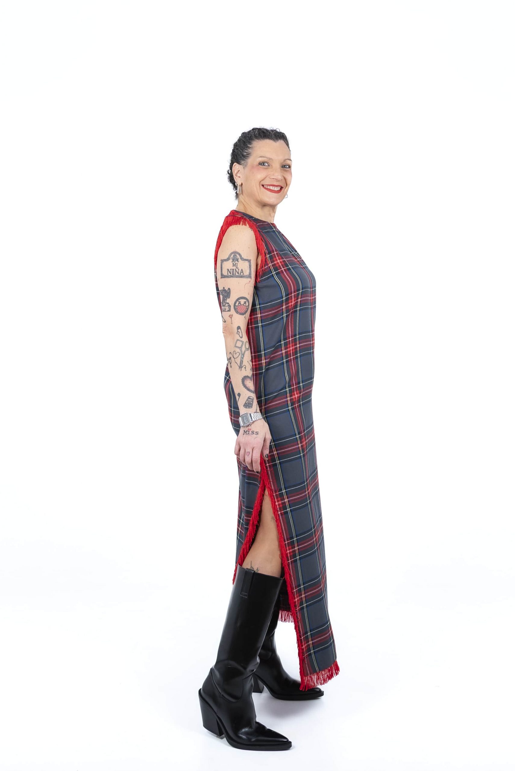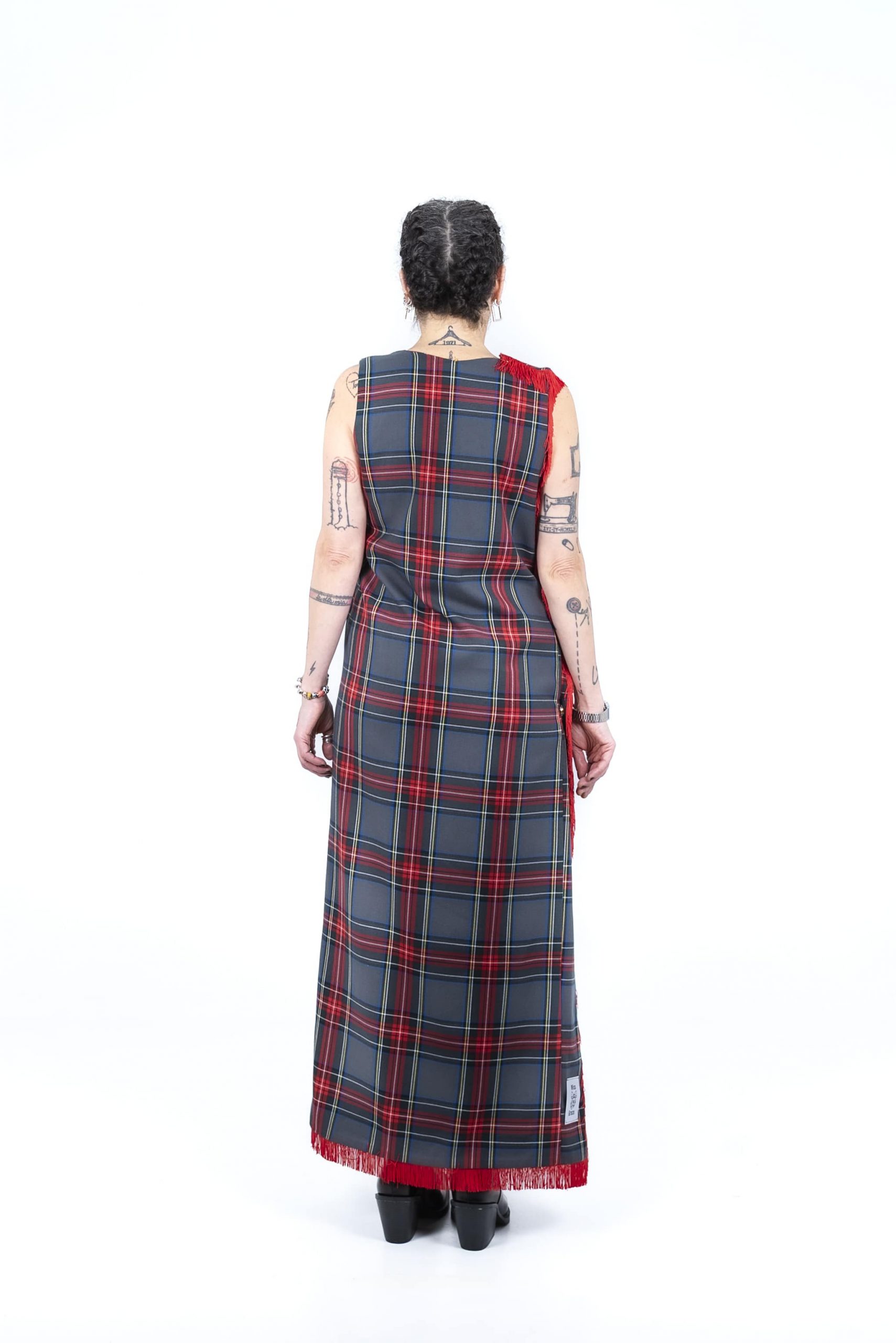Vestido largo de corte ajustado con diseño cruzado. Se cierra mediante broches situados en el lado izquierdo. La prenda está confeccionada en sarga de cuadros escoceses grises (64% poliéster, 34% viscosa y 2% elastano) y cuenta con un detalle de pasamanería, concretamente mimi fleco rojo, que recorre todo el lateral izquierdo y el bajo del vestido.